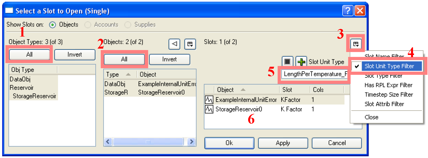 The unit type LengthPerTemperature was changed to LengthPerTemperature_F. Existing data in slots with this unit type must be updated. See the RiverWare 4.9 release notes in the online help for more information.” In RiverWare’s engineering methods, this unit type is only used in the K Factor slot on the “PanAndIceEvaporation” and “CurrentSurfaceAreaPanAndIce” evaporation methods. Users who have either of these two methods selected or are using this unit type on data objects will need to re-input the correct data into these slots. To identify if your model has slots with unit type, use the slot selector from the main workspace. Select
