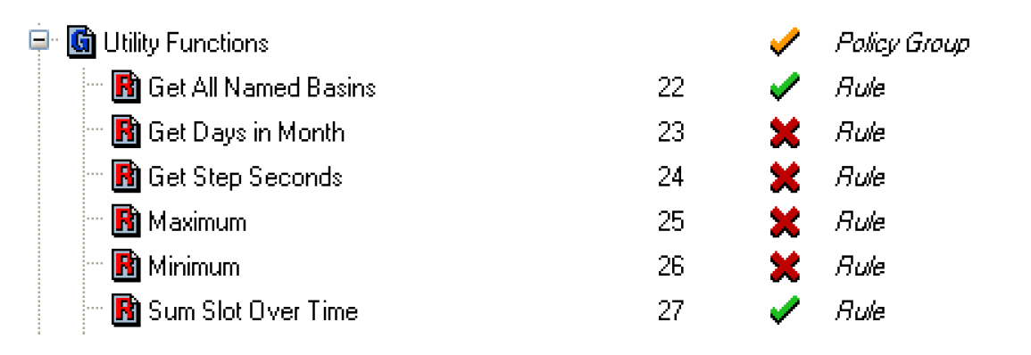 In the RPL dialogs, an orange check mark was added to policy and utility groups to specify that one or more items in that group is “off” as shown in the following figure. As before, the user can select the orange check to turn “off” the entire group, resulting in a red X. To turn it on again, restoring the previous state and showing an orange check, simply click the red X.