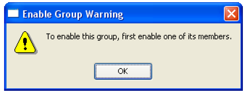 If all individual items in a group are turned off (red X), then the entire group is considered off and the group will also have a red X. If the user clicks on the group’s red X, a warning message will appear to indicate that at least one item in the group should be turned on.