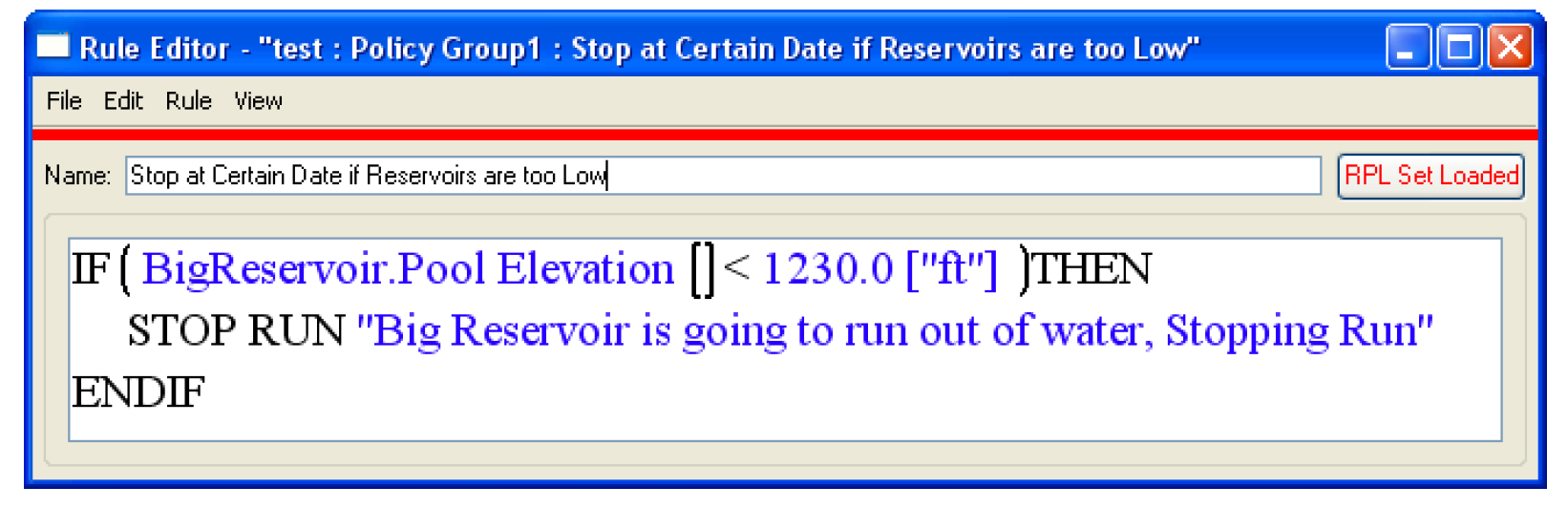 A new Stop Run statement was added to RPL for use as the uppermost statement in a rule. This STOP RUN <expr> statement is accessible from the Rule Add Stop Run menu. When executed, this statement will abort the run and post an error message contained in the specified <expr>. The new Stop Run statement provides functionality allowing a rule to stop a run at the uppermost level. Using the Stop Run statement with the new IF and IF ELSE statement allows a rule to evaluate an expression and stop the run if necessary as shown in the following figure: