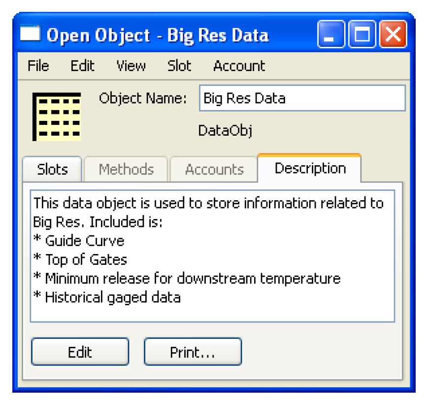A tab was added to the Data Object to allow the user to provide a description of the object. See screenshot. Descriptions can be copied/pasted to/from the system clipboard or printed directly to a printer or file.When printed, all of the descriptions for the slots on the object are also printed. See