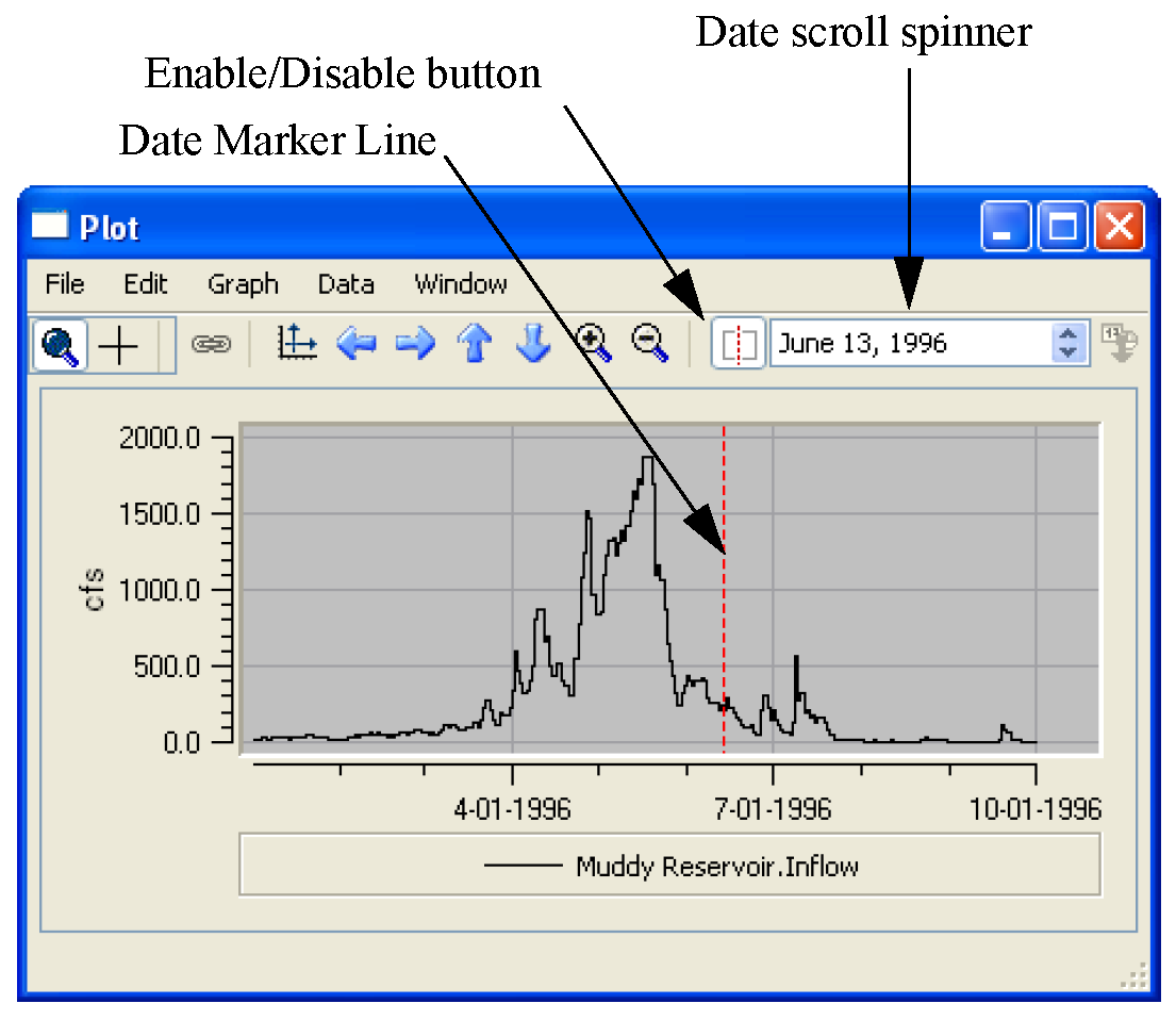 When enabled, an automatic red vertical marker line is shown at the date displayed in the date time spinner in the toolbar. The user enables/disables this marker using a button next to the date scroll spinner. Note, the marker line can be used when a Global Time Scroll operation occurs. Global Time Scroll operations synch all dialogs to the selected date. It can be selected from the right-click context menu on slots and plots.