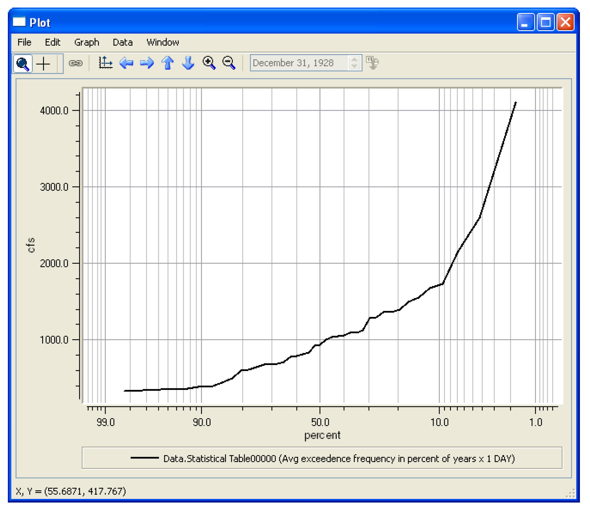 A true probability scale was added to plotting in RiverWare. When exceedence percent values from a statistical slot are graphed from the open slot or open object dialogs, they will automatically be plotted with the true probability scale. This scale has 50% as the center line, and the scale gradations go symmetrically and irregularly (using probability scale) outward to values approaching 0 and 100 as seen on normal probability paper. This replaces the “faux” scale that was previously implemented to plot standard normal variables. See