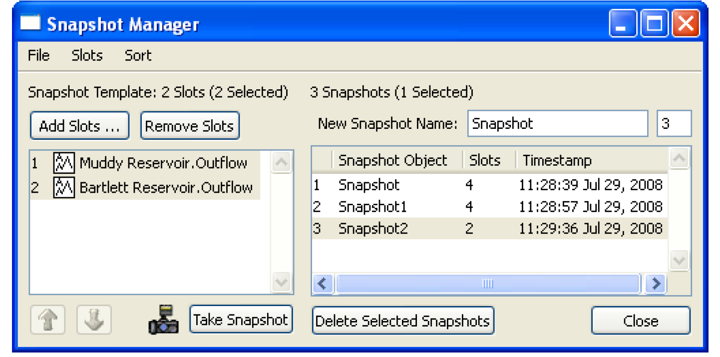 • A variety of slot order options have been added to the Snapshot Manager dialog including up and down arrow buttons and a Sort pull down menu. The typical cut, copy, paste, remove, select all, invert selection, and add slots menu items are available within the Slots pull down menu.