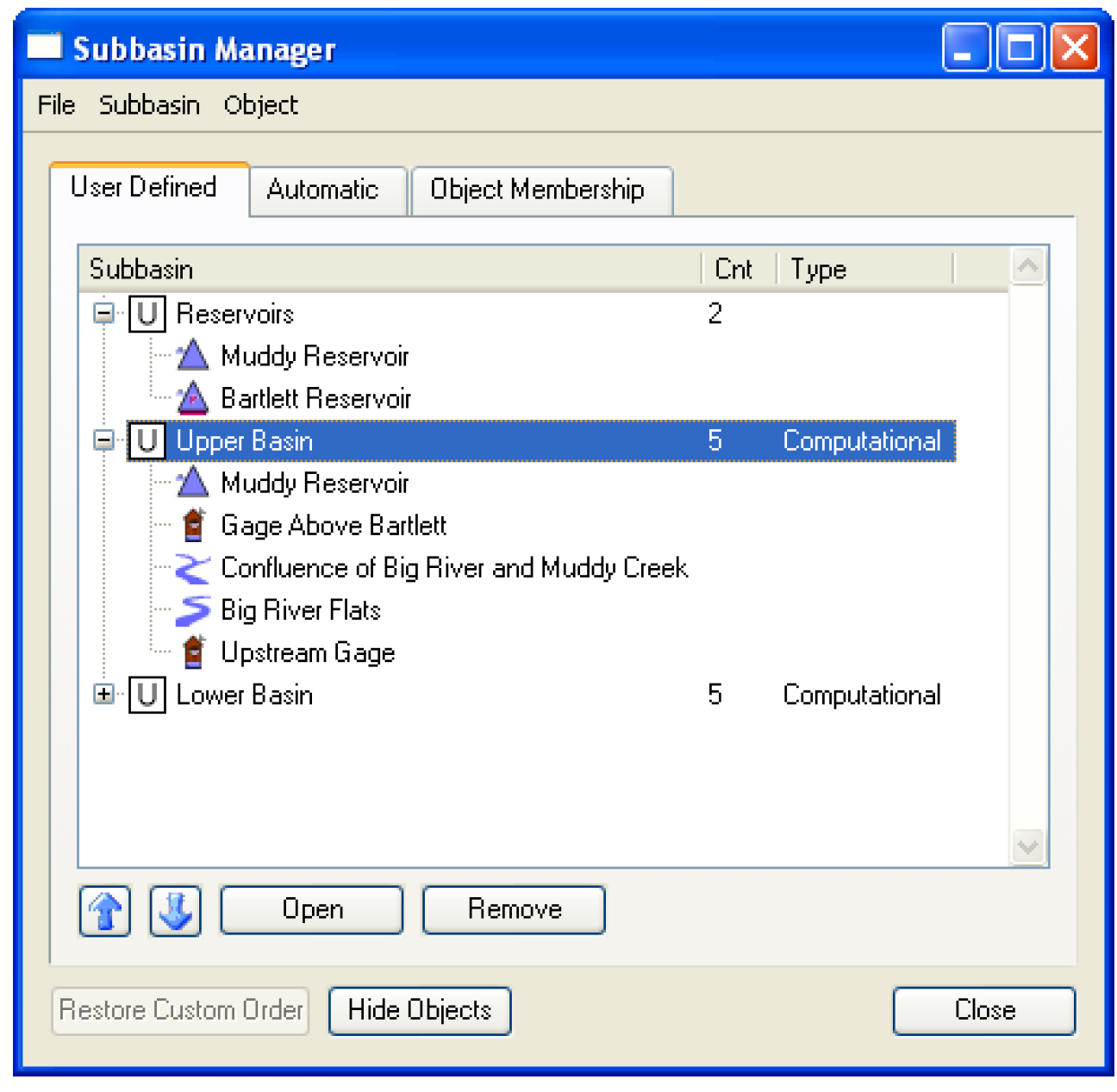Object Membership tab the user selects an object and subbasins containing this object are then shown in the list below along with the number of objects within the subbasins and the type of the subbasins. The subbasin list may be expanded in tree view to show all the objects contained within each subbasin on the list. This dialog now provides better support for re-organizing the list of subbasins and opening subbasins directly from the manager. For more information, see