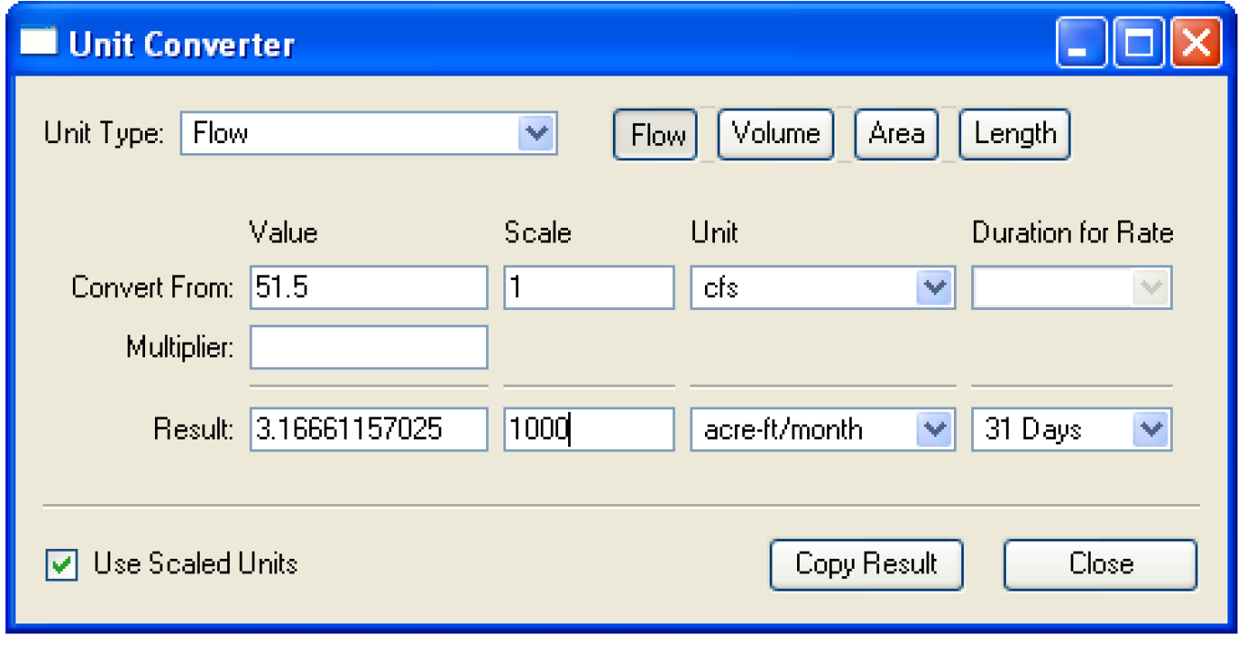 Unit Converter Dialog in User Interface for more information. Now there is better support for varying timesteps (i.e. months and year). The user can select the length of the month or year to use (where applicable). Also, there are quick buttons for the common unit types Flow, Volume, Area, and Length. Also, calculations are automatic; hitting enter is not necessary.