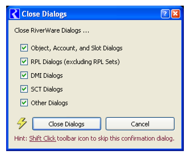 A utility was added to close multiple RiverWare dialogs. Clicking the Lightning Bolt icon (on the workspace and on RPL dialogs),