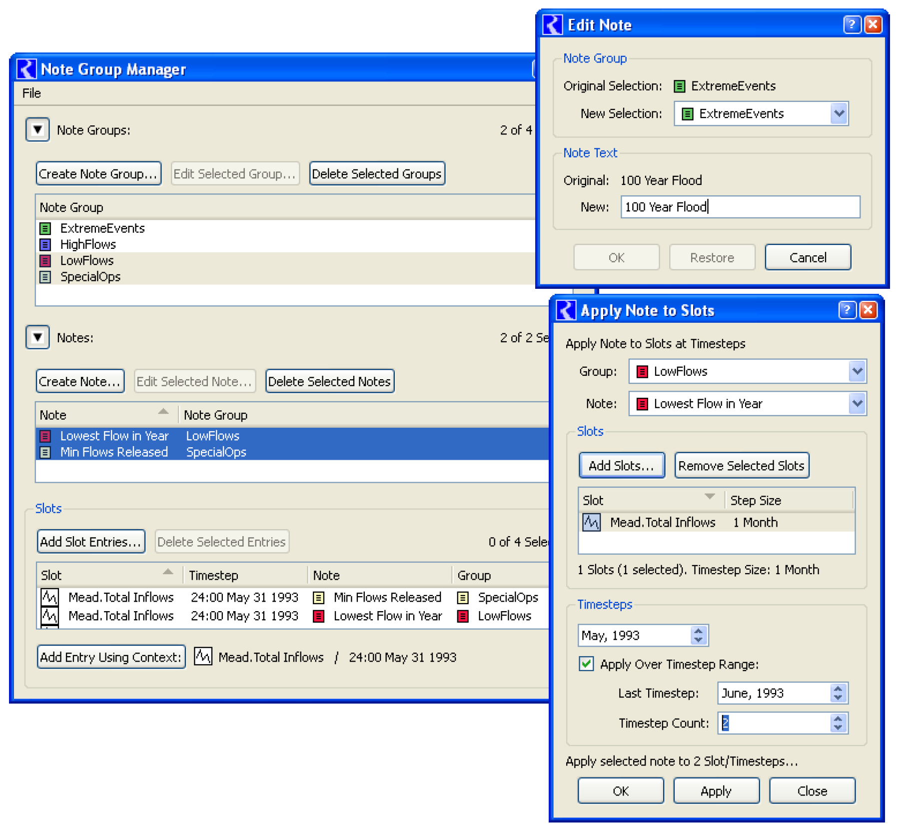 Notes on series slots were re-implemented. Notes, still organized within Note Groups, are now directly applied to individual series slot timesteps rather than by associating their containing Note Groups with whole series slots. Additionally, multiple notes can be associated with a timestep on an individual series slot. The note manager dialogs were re-designed; some samples of the dialogs are shown in the screenshot. See