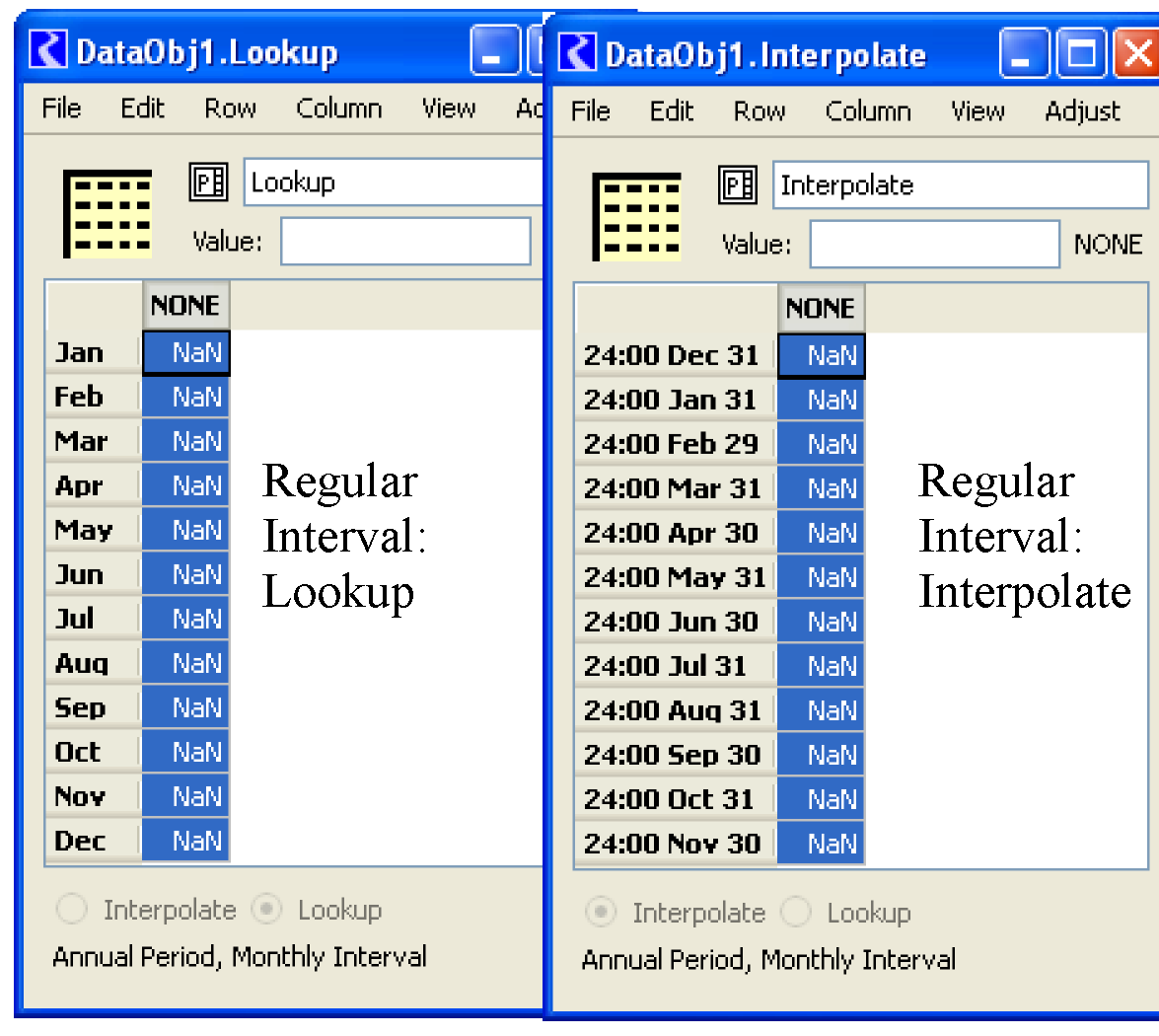 The display of row headings on periodic slots configured with a regular interval have been changed. For example, when added to a data object, the default Lookup and Interpolate slots are: