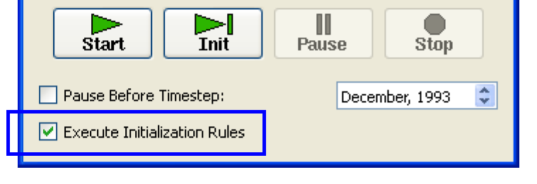 When there are initialization rules defined and you have either the simulation or rulebased simulation controller selected, the Run Control dialog now allows you to specify whether you wish to execute Initialization Rules. Check the box to execute the rules, uncheck the box to skip execution.