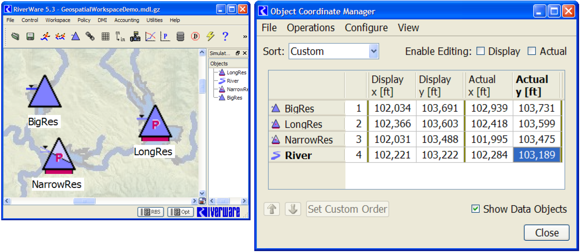 A new Geospatial View canvas was added to the RiverWare workspace. This canvas allows you to add and configure a georeferenced image file and then specify georeferenced coordinates for each object. This canvas also has enhanced display settings for the size of objects and label location, font and color.