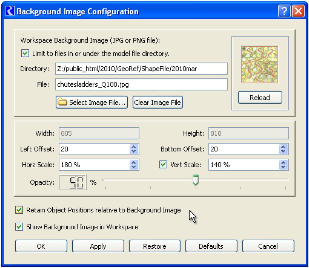 • When re-scaling the image or changing the pixel offsets from the left or bottom edges of the workspace, the user has the option to "Retain Object Positions" (in the Simulation View) relative to the background image.