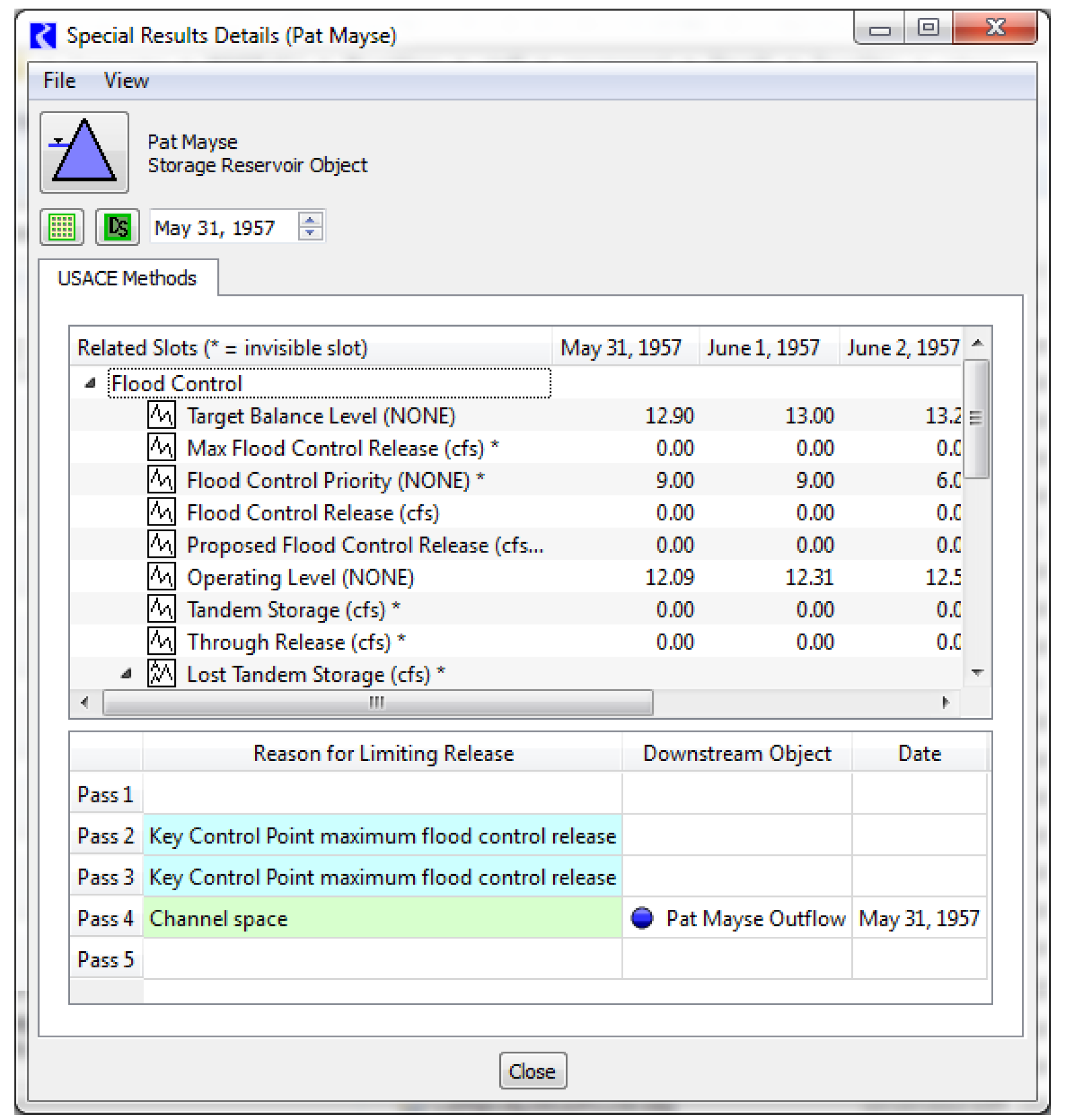This view shows the values for various slots involved in the algorithm. Because the forecast period is so critical, the dialog shows values from the specified timestep and throughout the forecast period. Information includes final and intermediate values and diagnostic information describing the reason that releases were limited.