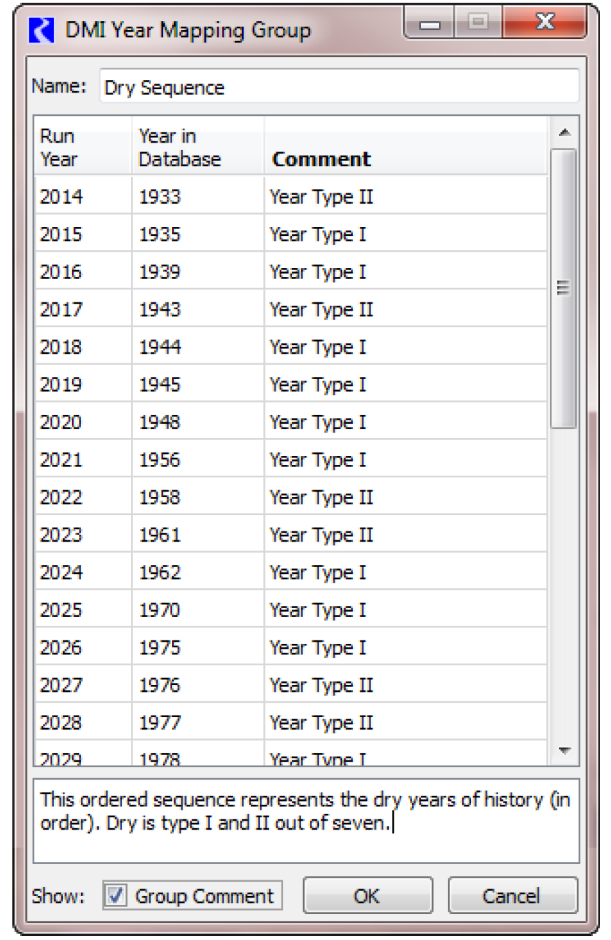 allows you to import data from specified years in your database to years in your run. For example, you might want to run your 16 year run (e.g. run dates from 1/1/2014 to 12/31/2029) with data from 1992, 1933, 1935, 1939, etc. This tool, shown to the right, allows you to create the map between the year in the database and the years of your run. Mapping groups are available for DAILY timestep models with a range that starts on Jan 1st and ends on Dec 31st. Mapping groups may only contain Input Database DMIs (DSS, HDB, or Excel).