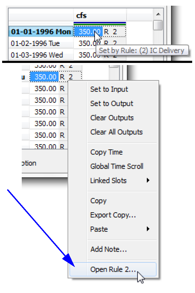 • Rule (<rule priority>) <rule name> Displayed when the value was solved for as a result of a rule setting a value elsewhere in the system. That is, the value was set during dispatching because a rule set a value somewhere. Example: “Rule: (18) Long Lake Fishery Releases”.