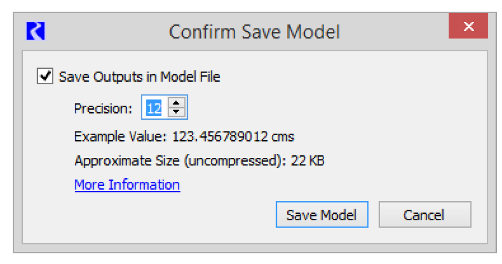 When saving model files, there is no longer an option to save with “extended precision” or regular precision. Instead, now input values are always saved with full precision (17 digits) while output values are saved with a user specified precision. Because saving full precision of input values will increase model size, you may want to decrease the precision of saved output values. This will allow you to offset model size growth as desired. The Confirm Save Model dialog gives you an indication of the uncompressed size of series data as you change the output precision.