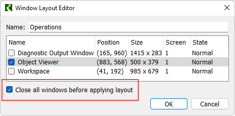 An option was added to the layout editor to close all windows before applying the layout. This is analagous to selecting the Close Windows (lightning bolt) utility before applying the layout.