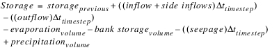 Evaluation | This function takes the target pool elevation value and converts it to a storage. This is the storage value desired at the target date. The difference between the target storage and the previous storage is the change in storage over the target range. Since the total inflow volume over the target range is given as an argument, the total outflow volume can be computed. Side flows are automatically included in the mass balance computation and thus should not be included in the inflow value provided in Argument 5. These include Hydrologic Inflow Net, Diversion, Return Flow, Canal Flow, Flow FROM Pumped Storage, and Flow TO Pumped Storage. If any of the side flow slots contain NaN on one of the target period timesteps, the value will be assumed to be zero on that timestep. Other sources and sinks, such as Evaporation, Precipitation, Bank Storage and Seepage are NOT included in the mass balance computation. The total outflow volume is then converted to a flow rate and divided by the number of timesteps in the target range. The result is a single timestep outflow value. This value needs to be set on the outflow slot for every timestep in the target range in order to meet the target pool elevation. | |