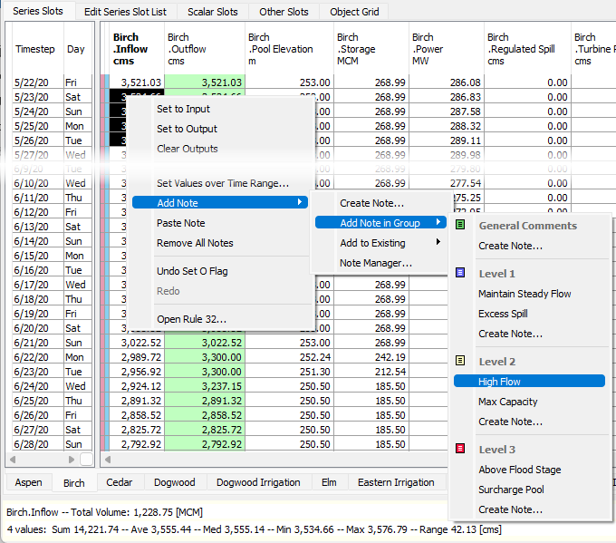 • Individually by slot. For example, most Input slots could use average, but the Input slot in Aspen reservoir could use minimum and the Input slot in Birch reservoir could use maximum.