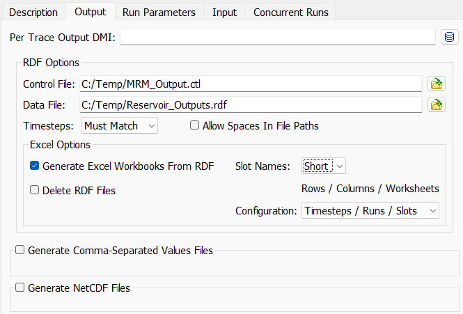 During a multiple run, output can go to an output DMI and/or one or more RiverWare Data Format (RDF) text files. Options are also available to send output to CSV files or NetCDF files. Select the Output tab of the Multiple Run Editor. The following figure and subsequent sections show the configuration options: