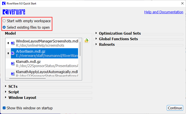 When finished selecting items, select Continue and RiverWare will open the selected files and show the workspace.