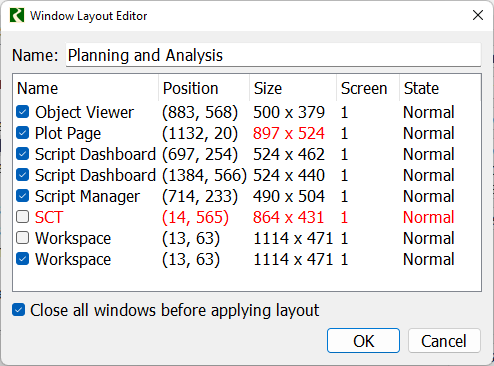 – Red items have changes compared to the saved layout. Individual items like position or size will be red if different. The entire row will be highlighted if a window is added to or removed from the layout. For example, The RPL Set Editor was saved in a Normal State at a different size, but now it is minimized and 583X383 pixels.
