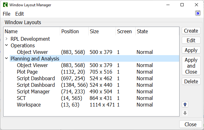 • Apply and Close button: In the Window Layout Manager, apply the selected layout by selecting the Apply and Close button. The Window Layout Manager then closes.