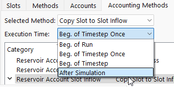 After Simulation | The method is executed after each timestep's simulation is complete and as accounting dependencies change. Note: This is the default for compiled methods and the only execution time in releases prior to RiverWare 5.1. Technically, the method is executed as part of the accounting beginning of timestep which occurs after all rules have executed and all dispatching is complete. Each method registers accounting slot dependencies when executed. Therefore, if a value in a dependent accounting slot changes, then the method will re-execute. | Accounting Slots only |