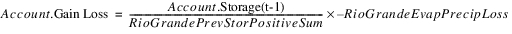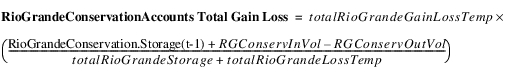 This total gain loss is distributed to the accounts based on estimated storage compared to the total conservation storage. This allows the conservation accounts to solve. In general, the Gain Loss for the RioGrande account can be calculated.