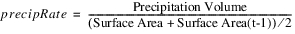 For a 1 Month timestep, this can be done based on the Precipitation Volume for the month, which was set in simulation. The Precipitation Volume calculation will already account for Ice Coverage if applicable. For a 1 Day timestep, Effective Precipitation must be calculated using the cumulative sum of Precipitation Rate from the beginning of the month to the current day, and Ice Coverage is included explicitly. At a 1 Month timestep the average surface area is used, whereas the current (end of timestep) surface area is used for a 1 Day timestep.