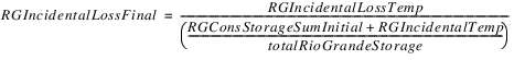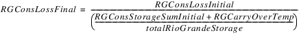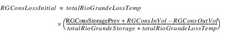 All other loss goes to the Rio Grande accounts. The temporary total Rio Grande loss is calculated as the difference between the Hypothetical Condition Loss and the Pre-Reservoir Condition Loss. If the reservoir has RioGrande “Conservation accounts,” that is any account of Water Type RioGrande that is not the “RioGrande” account, and the accounts have non-zero storage, then they are given a fraction of the loss equal to its percentage of total Rio Grande water in the reservoir. All remaining loss goes to the RioGrande account.