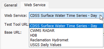 The Web Service tab includes the web service to use, a test tool URL, the base URL, and any other necessary information. Select the desired Web Service from the menu.