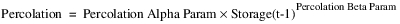 The exponential term is computed in user units. That is, Storage(t‑1) is converted to user units, raised to the power of Percolation Beta Param, and then converted back to the standard RiverWare units before being multiplied by Percolation Alpha Param).