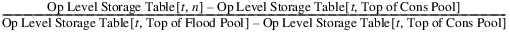 At the beginning of run, the Conservation Pool Storage Fraction is populated as described above. Then, the Flood Pool Storage Fraction is populated as follows: For each date (row) and each level, n, (column), the equation to compute the fraction is:
