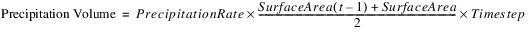 This method is analogous to the Input Evaporation method in simulation and requires the Input Evaporation method to be selected for the Evaporation and Precipitation category. Evaporation Rate and Precipitation Rate are entered as a time series. Evaporation is calculated as a product of Evaporation Rate, Average Surface Area over the timestep and Timestep length. Similarly Precipitation Volume is calculated as the product of Precipitation Rate, Average Surface Area and Timestep length.