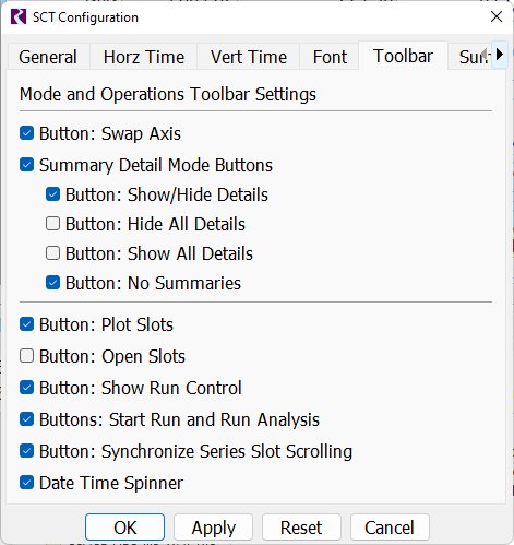 This tab allows you to specify which buttons to include in the SCT toolbar. You can include the buttons you use frequently and hide the ones you do not need. See SCT Toolbar for details.