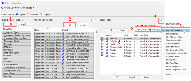 4. Any slots that appear in the slot area (6) have this unit type. Select one of them, and select OK to bring up the Open Slot for that slot. If you were making this selection from the SCT, you would have been able to select all and then show them in the SCT. To find slots that have a different attribute (or multiple attributes) use any of the other filters. For example, you could enable the Slot Name Filter and find only slots that have a certain name.