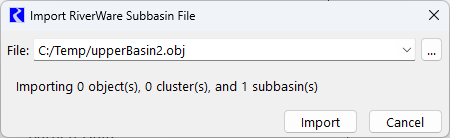 Import with the File and then Import Subbasins menu. This opens the Import RiverWare Subbasin File window. If the selected file also contains objects, then the window contains the same options as when importing the objects themselves.