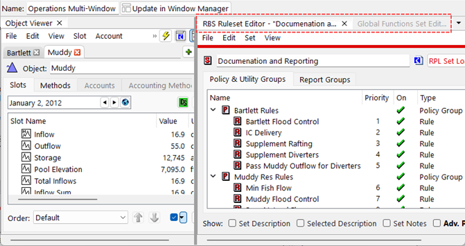 The Multi-Window is a general window into which other RiverWare windows can be docked. When using RiverWare, you may need to open many windows, and it can be challenging to manage each of the windows individually. The Multi-Window allows you to place windows in a fixed location in a larger window where they can then be moved together, minimized, maximized and maintain their spatial relationship to one another.