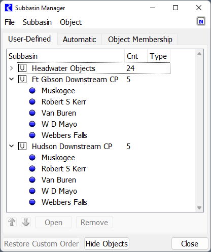 The following image shows the Subbasin manager with three subbasins: Headwater Objects along with two Reservoir Downstream CP subbasins, one for Ft Gibson and one for Hudson. Note, these are tandem reservoirs so they both contain the same downstream Control points.