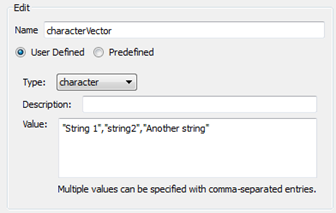 • Character. A character argument allows a character string or a vector of character strings to be passed. The following figures show possible valid entries for character argument values.