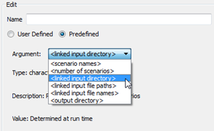 • User Defined. The argument is user-defined. You must specify values in the Type, Description, and Value fields; see User-defined Arguments below for details.