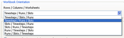 The data sheet layout is determined by the user-selected workbook orientation option. The three workbook dimensions—rows, columns, and worksheets—can be mapped to the three data dimensions—timesteps, slots, and runs, allowing for six possible workbook orientations. The following orientations are common: