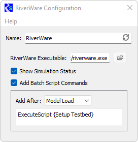 Select the check box if you want user-defined RiverWare Command Language (RCL) batch script commands inserted into the RCL script used to configure a model file for a scenario. You can enter the commands in the text box below.