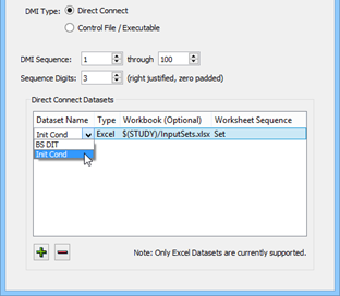Required field. Specify the name of the dataset to use. You can select the name from the menu, which lists all the Excel datasets in the RiverWare model, or you can enter the name directly in the text box. This entry must match exactly the name of an Excel dataset configured for the DMI in the RiverWare model. If the entry does not match—for example, if the dataset was deleted from the model—the text box is highlighted yellow to indicate the error.