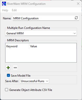 Select the MRM configuration file from the menu, which lists all MRM configurations defined in the specified RiverWare model.