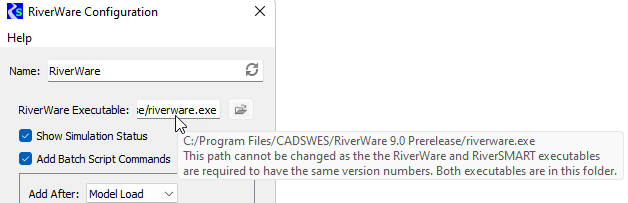 Because RiverWare and RiverSMART are distributed and installed together, the RiverWare event now knows the location and version of the RiverWare executable. The RiverWare Event no longer allows the path to be edited. Instead, it shows the current path in the dialog with a tooltip giving more information as shown: