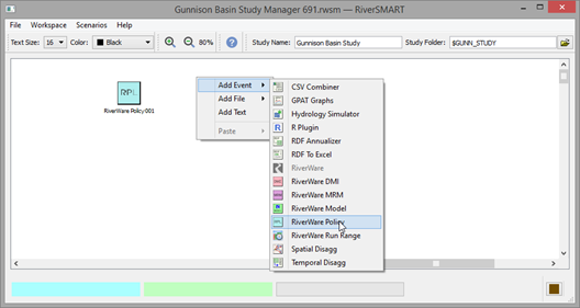 A more transparent approach is to create DMI and policy events in RiverSMART to be paired with an MRM configuration event. RiverWare substitutes the DMIs and policy configured in the RiverSMART events into the MRM configuration to create the scenarios. In this approach, the RiverSMART workspace provides a visual representation of how the scenario components are combined into scenarios.