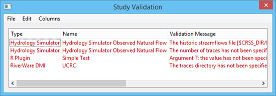 The Validate Study option on the Workspace menu validates the configurations of the events and files shown on the workspace. Validation varies with the event or file, but generally includes verifying that required configuration information is provided and that referenced files that should already exist are available and readable.