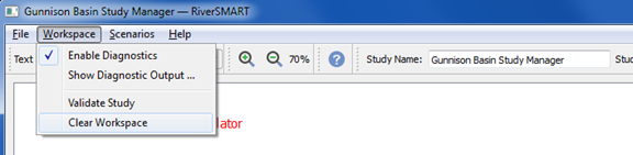 The RiverSMART Workspace menu includes options for controlling the collection and display of diagnostic messages, validating the configurations of the events and files in the workspace, and clearing the workspace.